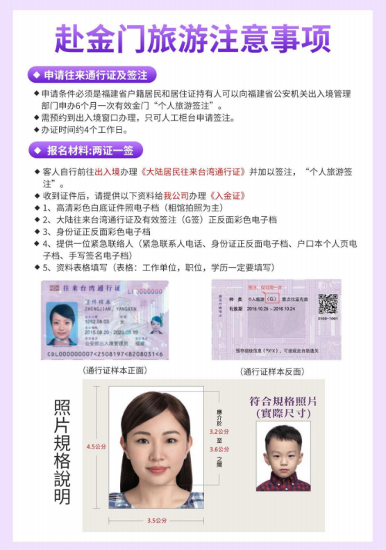 | 活动基本信息 报名参加活动 网上付款退款规则 »会员在截止报名前未收到邀请信及平台手机通知短信的,视为未获邀请,已付款项将自动退还至个人账户(手机号码请确保正确)。 »本活动截止报名前任何时刻退出报名,网上已付款均全额退还。 »活动过程中遇上纠纷,请在活动结束后三天内从已报名活动中发起申诉;无申诉的,视为同意在活动结束三天之后自动结算已付款给组织者。 活动详细内容 组织者口碑(0) 本旅游产品,为福建鑫超越国际旅行社招徕,由公司提供合同,组织执行 【咨询电话/微信】15960275146 红豆 【发团日期】2月18、19、21 【行程报价】1299元/人 行程特色:1、必游景点 :跳島遊大小金門一次暢遊、莒光楼、翟山坑道 饱览金门风采 2、乐游:造访「年年」被评选为台湾最幸福城市的金门,让您同时拥有闽南文化、侨乡风貌、战地特色、 自然生态等丰富的旅程 3、必购好康 :亚洲最大的免税购物商城 ,您不用出国即可选购各式的进口商品(有皮件、烟酒、保养品等),让您享受购物的乐趣 ,省下出国的昂贵旅费。正宗贡糖、一条根等热门商品 ,让您满载而归! 特别准备一条根养生茶无限畅饮 交通安排 :当地安排巴士 ,让您舒适游金门 ![]() 行程安排: 第一天 餐:中晚 住:金门 集合于五通客运码头候船大厅 ,搭乘豪华客轮前往金门。 【翟山坑道】为一 A 字型战备水道,总长约 357 公尺,因应战争所需而开挖,耗时三年才完成,战时供登陆 小艇抢滩运补用,坑内并有停靠码头。一进入坑道内即可感受它的震撼力,望着深遂的倒影 ,是多少人流 血流汗才可建造出如此伟大的工程。(游览时间约为 40 分钟) 【金门大桥】下车拍照 为台湾第一座深水域的跨海大桥,连接大金门与烈屿乡 ,,总长为5.41 公里 ,最 大跨径约 200 公尺 ,为金门最新地标。 【八达楼子】车游是一座仿城堡式的建筑 ,高约数十丈 ,楼顶上塑有 7 位分据四方成备战姿态 ,手握手榴 弹或机关枪的英勇战士雕像 ,这是为了纪念 1933 年抗日战争中 ,驻守在长城古北口死守隘口 ,杀敌数百 人之后壮烈牺牲 ,成功完成任务的 7 位勇士而建。 【沙溪堡】位置特殊 ,可眺望大胆、二胆、槟榔屿及厦门 ,军事上更肩负重要责任 ,如同大小金门各个军 事据点,营区里碉堡、弹药库、坑道一应俱全,随着驻军的裁撤,经过营区活、重新整建 【双口海边】距离厦门岛最近之海岸,海滩宽广平坦,视界开阔,潮汐在线可看到军事设施轨条砦 ,三层重 迭 ,绵延数里 ,沙滩凉亭上望远镜可眺望狮屿、槟榔屿、厦门风景会展中心、一国二制统一中国、五缘湾 等近在咫尺 ,也是每年金厦泳渡比赛活动地点。 【莒光楼】气宇非凡的莒光楼造型概念 ,源自于古典建筑的做法 ,使得整座建筑呈现雄浑的气势。驰名国 内外,更是许多国内外宾客访金的第一站,为战地金门著名的地标性建筑。听取多媒体简介 ,认识全新的 金门 ,站在莒光楼上可以远望小金门 ,眺望厦门。 【圣祖贡糖】金门第一品牌 ,品尝美味的金门特产。 【金门一条根】金门所研发出各种特有之药草例如〝一条根〞〝海芙蓉〞等。 【金门钢刀厂】利用金门历经炮火轰击留下百万发废弹壳。吴君有计划搜购全岛废弹壳,凭借过人刀 艺 与巧思 ,锻造出中外驰名的「金合利钢刀」 ![]() ![]() 第二天 餐:早中【山后民俗文化村】当地习称的“十八间”,为18栋传统闽南古厝组成的聚落,乃清光绪2年(1876年) 旅日侨领王氏父子建造给族人居住的华屋,包括 16 栋二落大厝、一栋三落大厝及 1栋王氏宗祠,当时特聘唐山师傅施工建造,在建造时用上最讲究、最精细的工法 ,看上依山面海 的风水灵地 ,打造格局型式、排列工整划一 的闽式建筑,配合精雕细琢的彩绘石雕、砖雕交陶装饰,历时 25 年完工;山后民俗文化村绝对是集闽式建筑艺术大成的地点。 【狮山炮阵地】所属震东坑道开凿在花岗岩岩层内..也就是在金门东部的狮山腹内..坑 道全长 508公尺 平 均高度 4.6 公尺、宽度 3.6 公尺阵地设施完整。参观炮操表演为中外来宾参访金门不可错过的游程! 【陈景兰洋楼】为金门旅居新加坡侨商陈景兰于公元 1921 年兴建的洋楼宅第,先后受到日军及国军的占领, 后来成为金门官兵休闲中心,净白色的外观及精致的雕花与对称拱门,犹如西洋建筑的工法 ,是陈景兰洋 楼最令人印象深刻的部份。 【中山纪念林】游览游览金门国家公园管理处【乳山故垒】观看各类武器展示,榴炮阵地,内有【蒋经国纪念馆】 ,该纪念馆内保存蒋经国在金门期间的各类物品等 ,漫步园区拥抱大自然、享受森林浴、吸收芬多精。 【升恒昌金湖广场】观光客到访金门必逛! 比邻太湖及金湖饭店旁, 占地 9,000 坪的升恒昌金湖广场是 全台最大的免税店 ,提供全球旅客如同精品百货般的购物享受。 【高粱文化馆】金门高粱周边产品,主营高粱酵素 ,高粱醋 ,高粱面膜...等。 行程后前往码头搭乘客轮返回厦门。程愉快结束! ![]() 费用包含:1 、 用 车 : 金 门 当 地 游 览 巴 士 ( 根 据 人 数 安 排 车 型 ) ; 2 、 保 险 : 个 人 旅 游 意 外 医 疗 险 ; 3 、 导 游 : 领 队 及 当 地 地 接 导 游 , 司 机 小 费 ; 4 、 用 餐 : 含 1 早 3 正 8 0 元 餐 标 ; 5 、 住 宿 : 金 门 当 地 A +酒 店 1 晚 ( 2 人 / 间 ) ; 6 、 船 票 : 厦 门 - 金 门 往 返 船 票 ; 7 、 清 洁 费 : 两 地 码 头 清 洁 费 ; 8 、 签 证 : 入 金 证 办 理 费 用 ; 9 、 门 票 : 行 